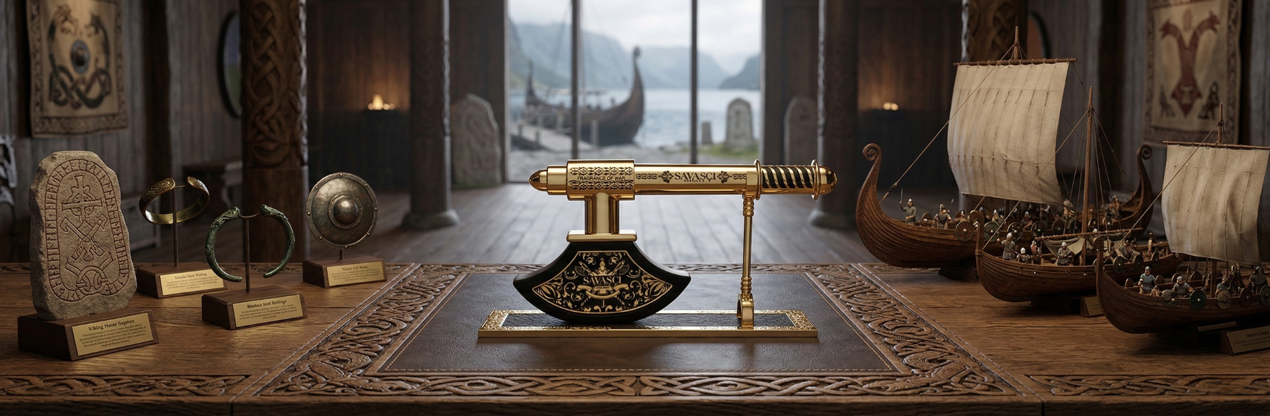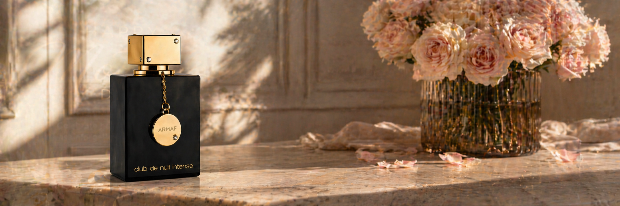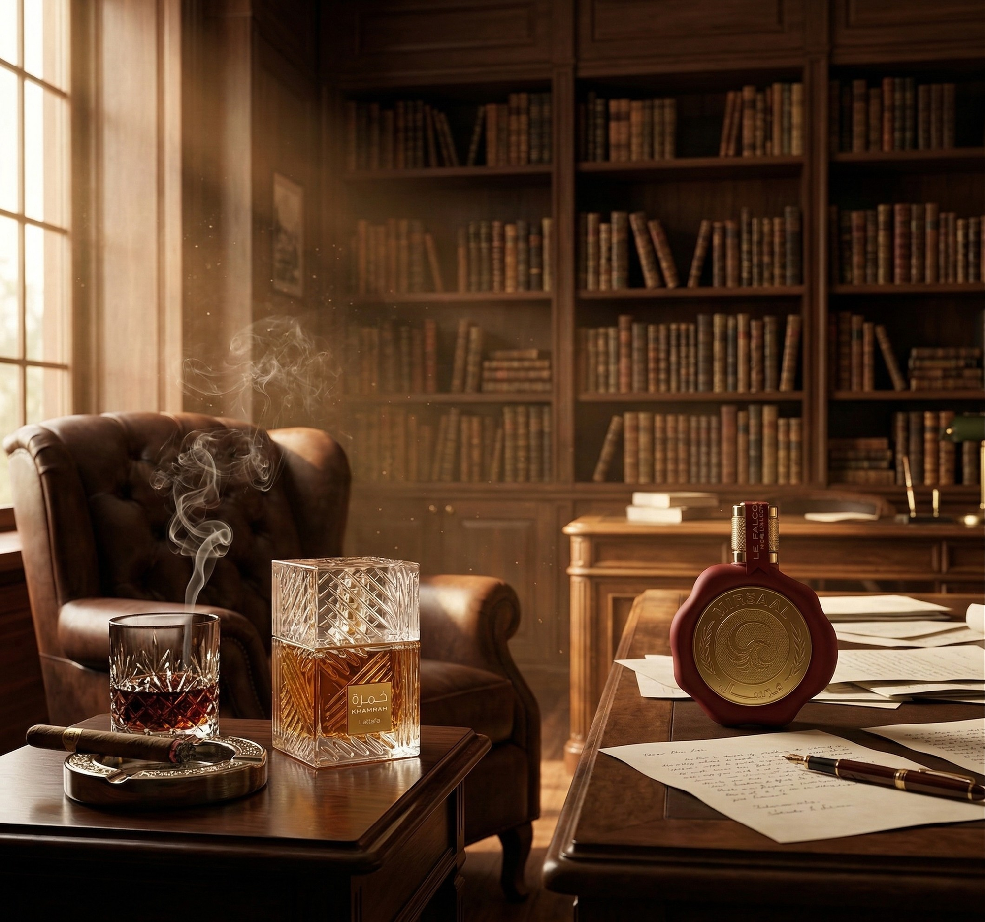 Step into a world of refined elegance where fragrance meets atmosphere. Set within a classic study lined with leather-bound books and warm amber light, this scene captures the essence of timeless luxury.