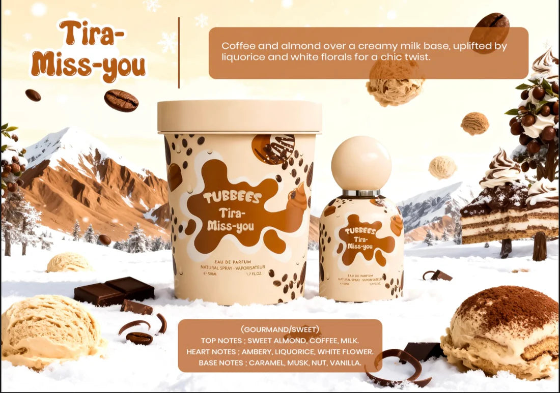 An elegant gourmand built on a creamy milk accord. Bright coffee and silky almond introduce a modern tiramisu impression, refined with ambery nuances, soft white florals, and a subtle licorice accent. The dry-down lingers in plush caramel, musk, vanilla, and toasted nut.